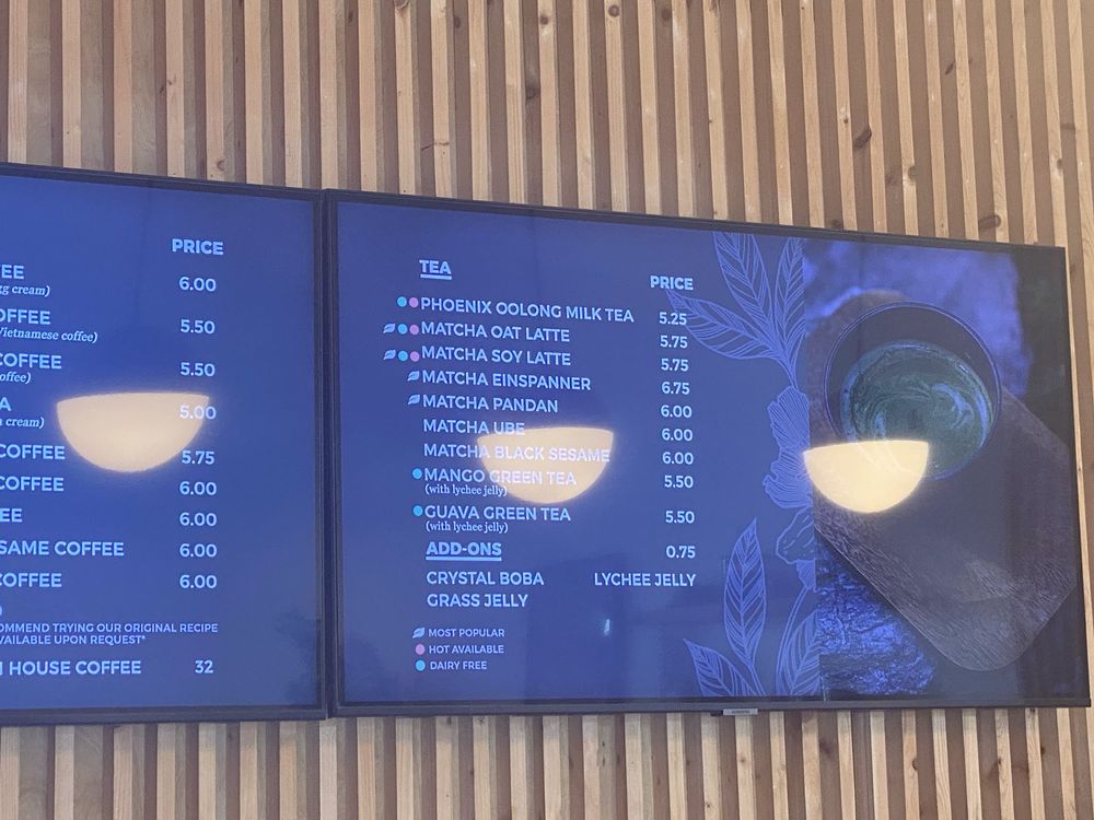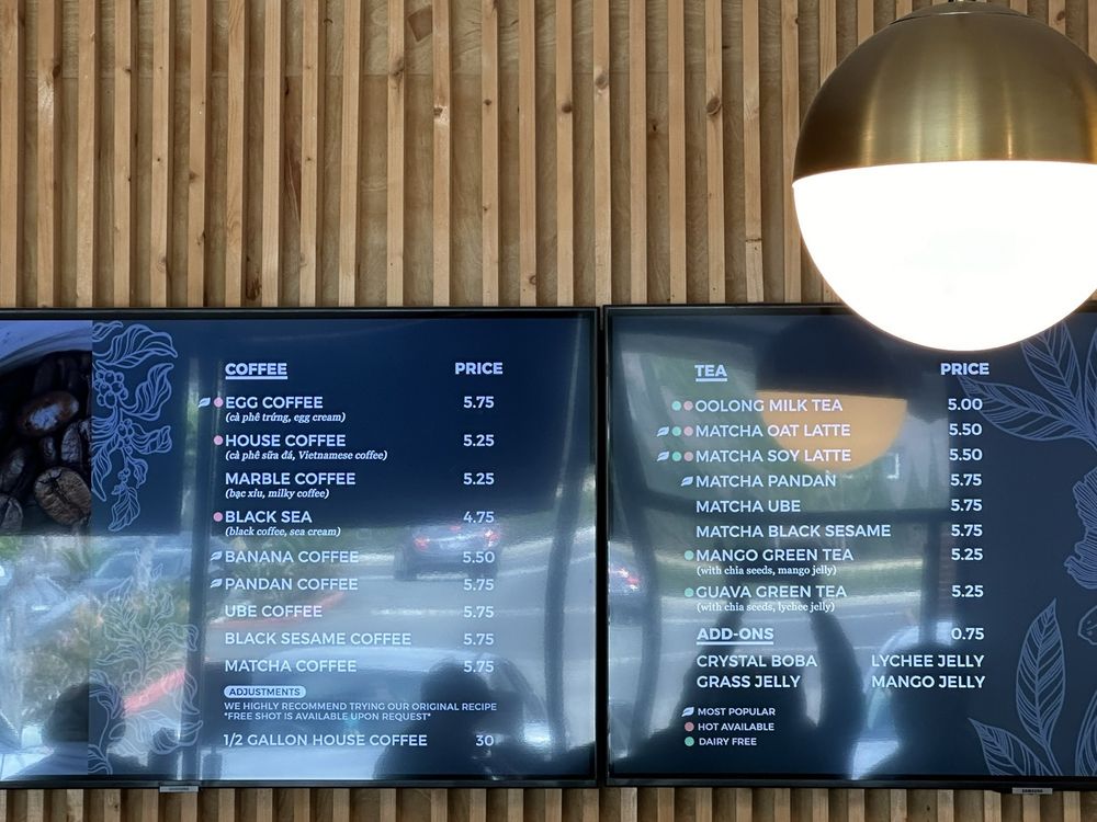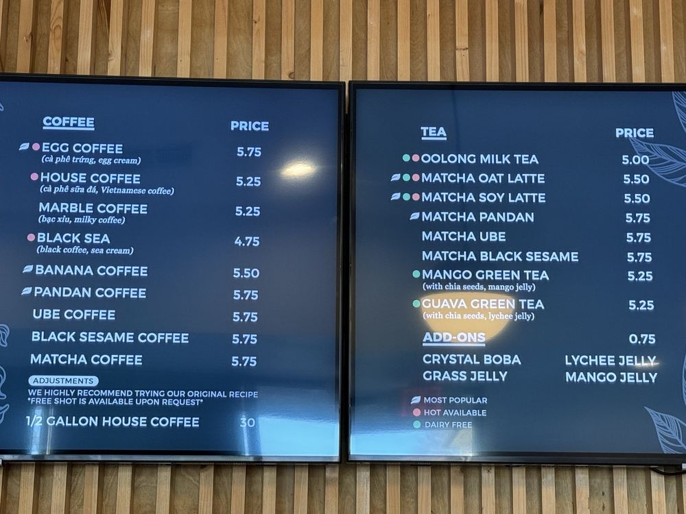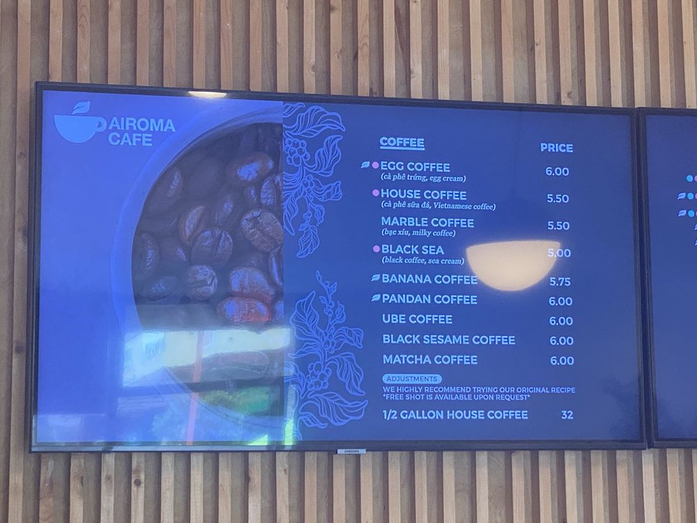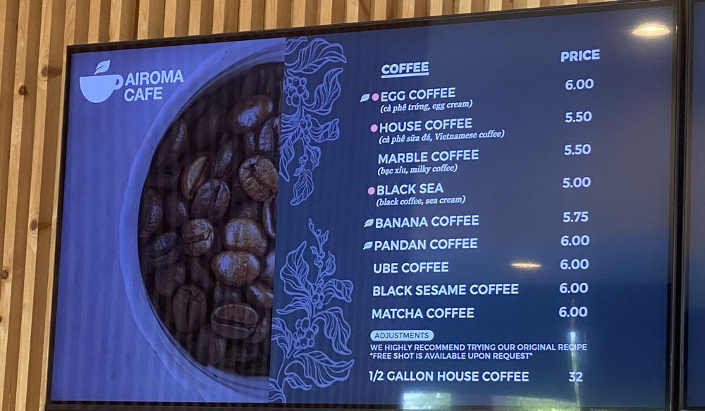 At Airoma Cafe, located in Garden Grove, CA, you can experience a unique menu featuring specialty coffee and tea beverages. The Banana Coffee, Black Sea, and Black Sesame Coffee offer rich flavors and smooth textures. The Guava Green Tea and Mango Green Tea are refreshing options paired with lychee jelly, while the Matcha Black Sesame provides a ceremonial-grade matcha experience. Customers rave about the Marble Coffee, Matcha Einspanner, and Vietnamese Classic Egg Coffee, praising the rich flavors and creamy textures. The cafe offers a cozy ambiance with ample seating, making it a perfect spot for enjoying delicious drinks. With quick and efficient service and a focus on quality ingredients, Airoma Cafe stands out as a must-visit coffee and tea destination.